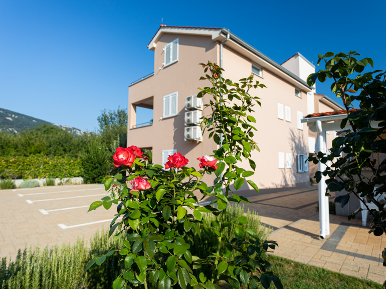 Pogled na more i na mjesto. Stan se sastoji od privatnog ulaza, podruma veličine 34 m2, prostranog dnevnog boravka sa kaminom, kuhinje sa blagovaonicom, dvije spavaće sobe sa en suite kupatilima, toaletom, prostranom terasom sa kaminom, te balkonom. Pogled na more i na mjesto.